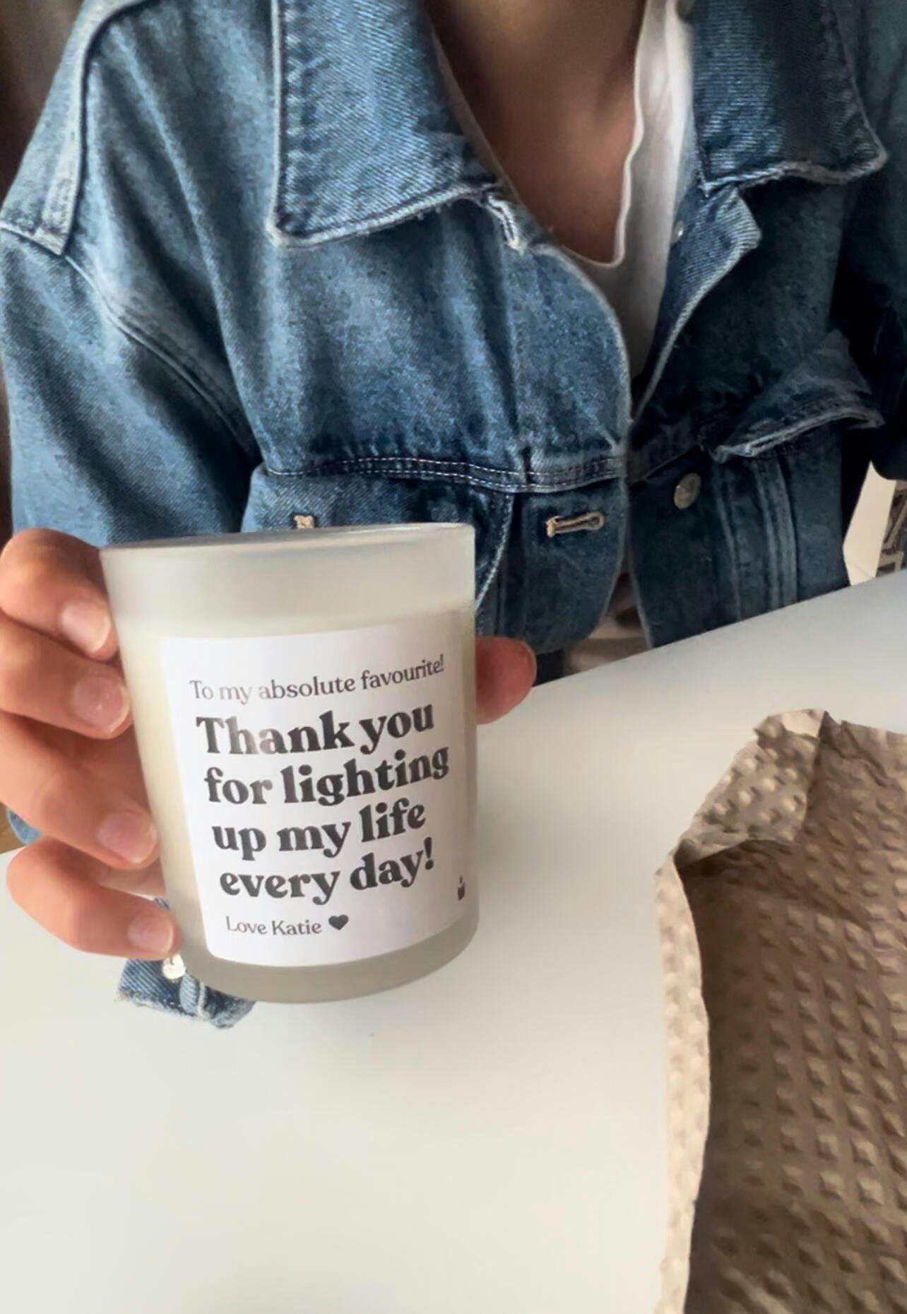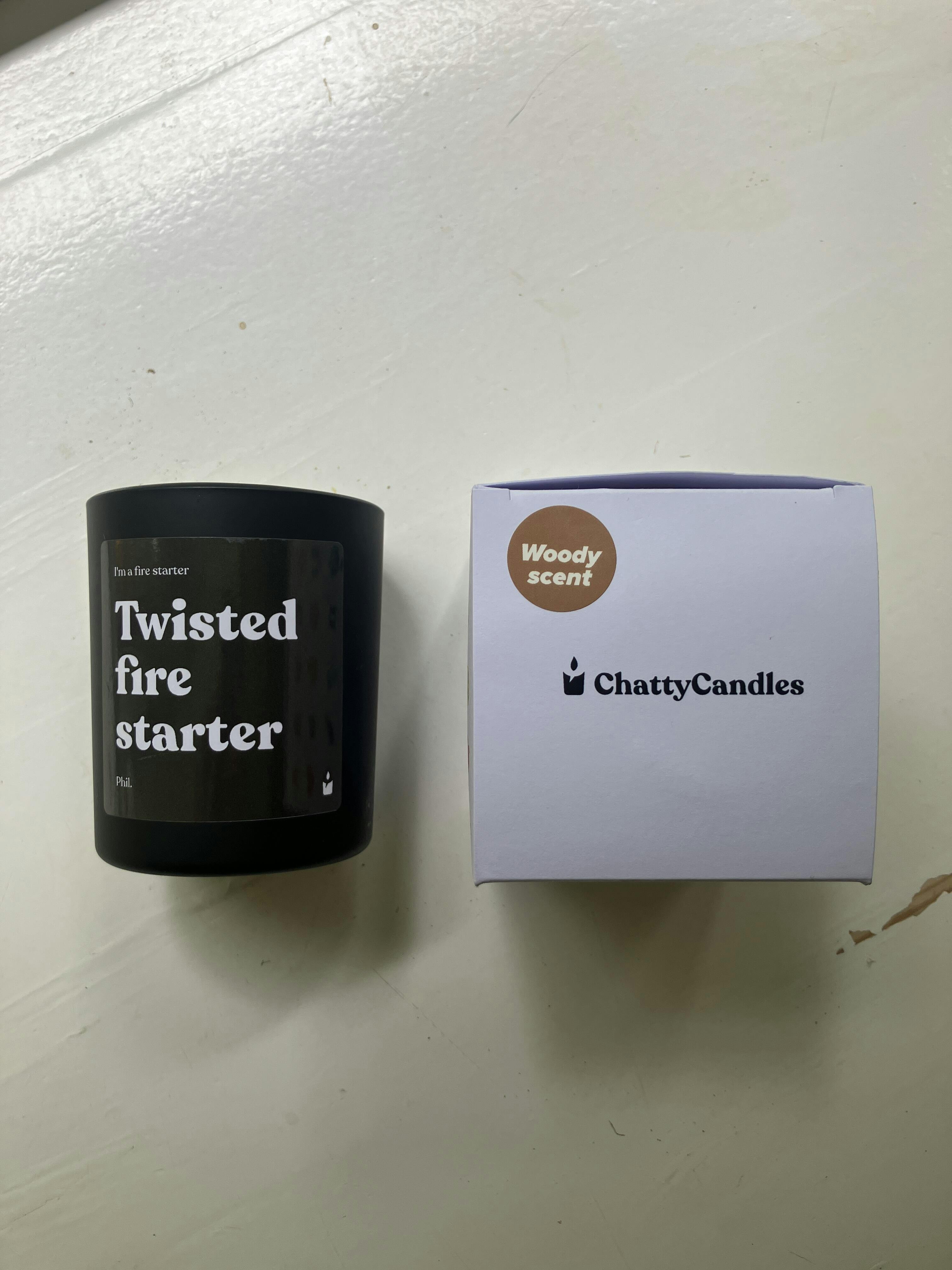 I got a woody scented white candle with custom phrase as a gift to a friend, and was very happy with my order! The shipping was fast, the packaging was really nice and professional, which added to the occasion, and the candle looked beautiful. I will definitely use the chatty candle service again for getting great personalised gifts!