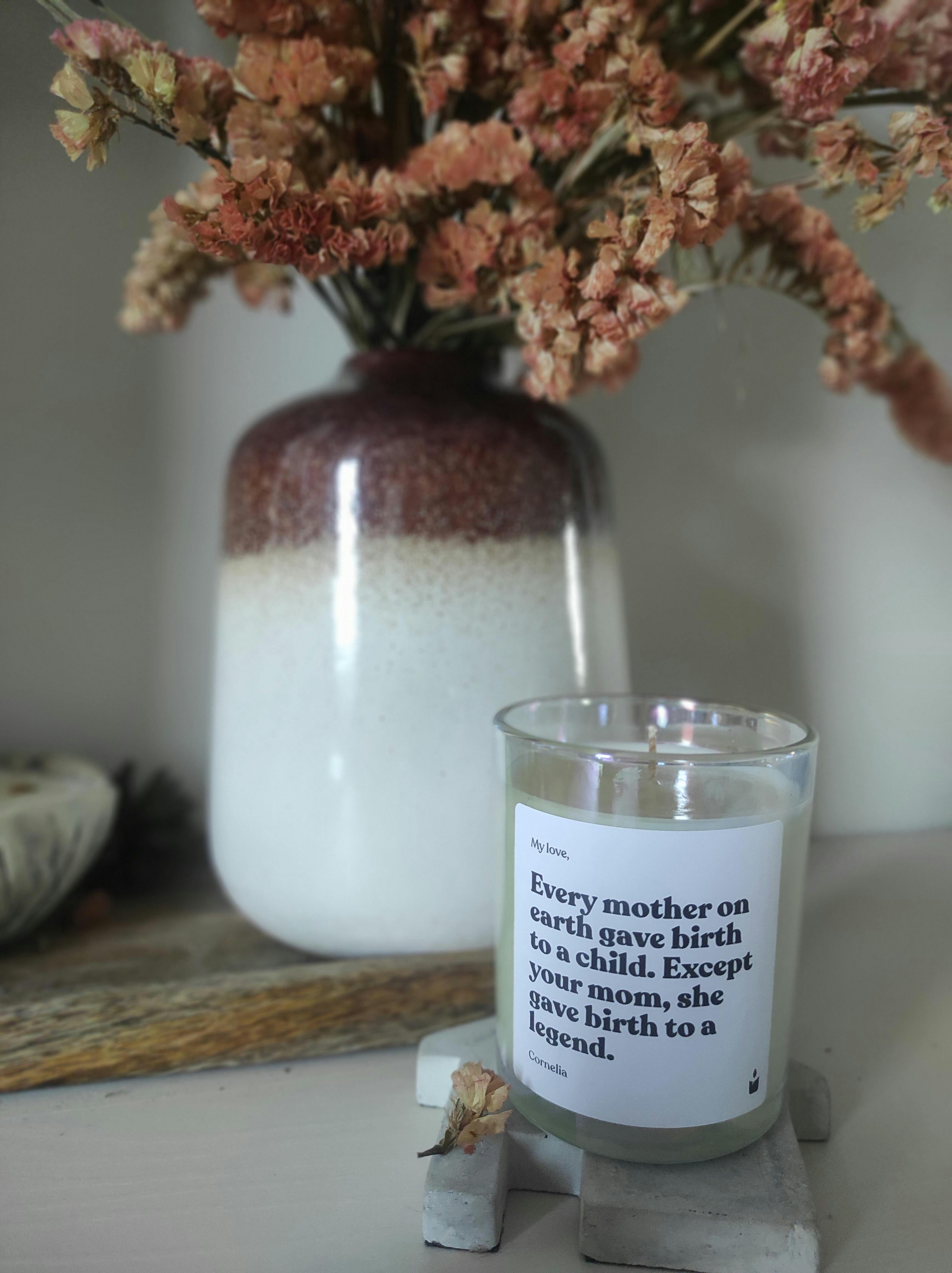 Gave this candle as a gift to my wife, and it has quickly become her favorites! The scent is absolutely delightful. What makes it even more special is the ability to personalize it with her favorite quote, adding a personal touch that makes it truly unique!