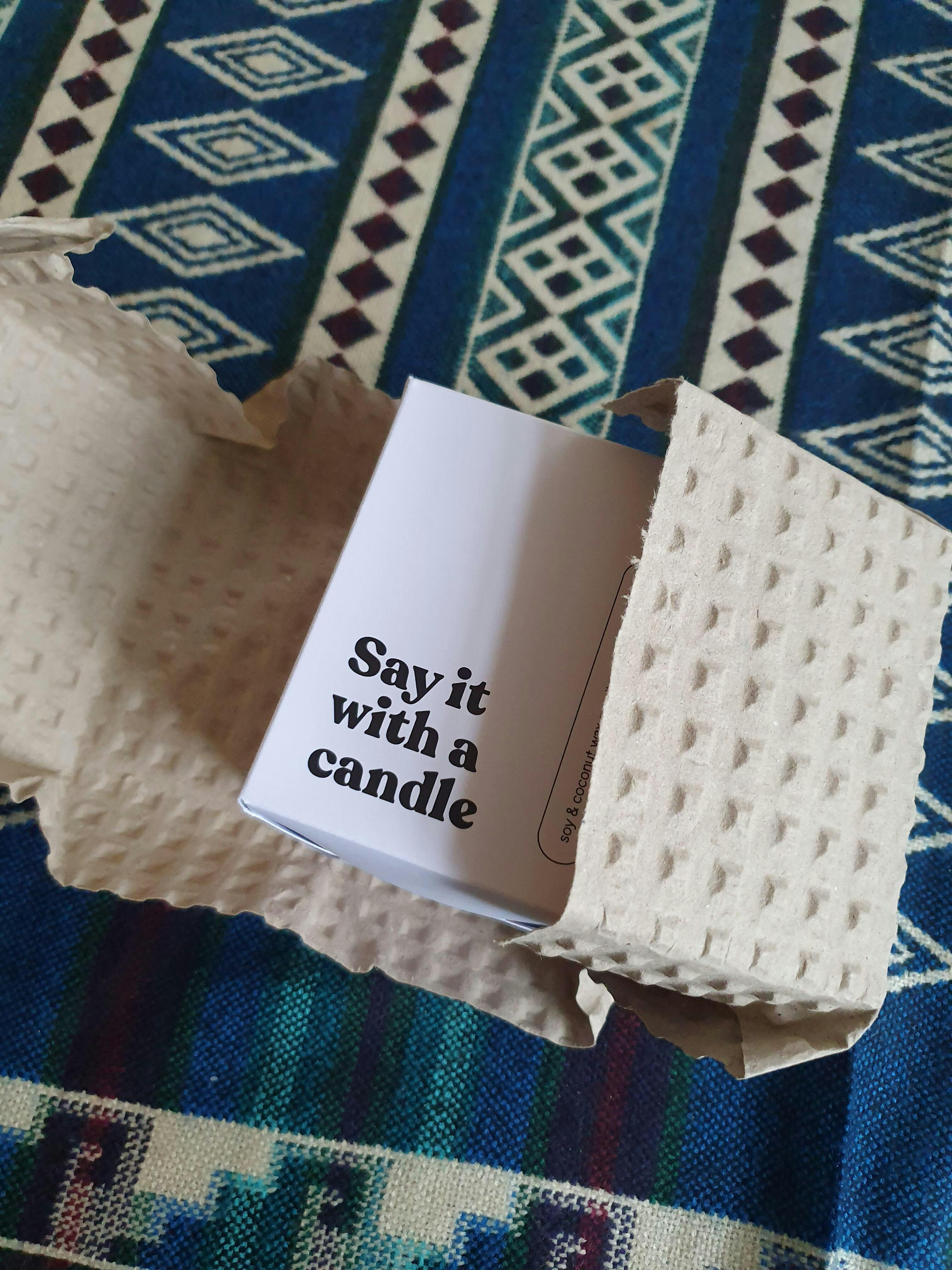 I ordered the candle on Thursday evening and was pleasantly surprised to receive it by Monday noon, which is less than 2 business days. It arrived safely packaged in an eco-friendly cardboard box, which I really appreciated. Inside, the candle was nestled in a beautiful box, carefully wrapped in soft, wrinkly paper to avoid any bumps during delivery. The scent is refreshing and summery, with a subtle and natural fragrance that I really enjoyed. The design is simple and fits perfectly in any room. My girlfriend and I also got a good laugh from the playful message on the candle.